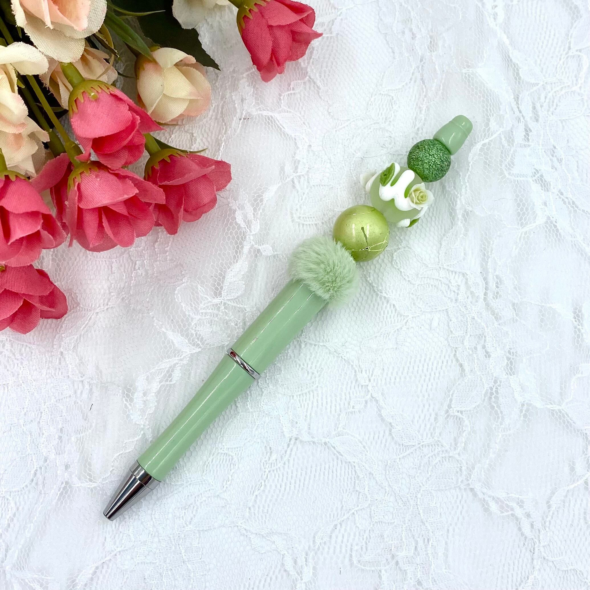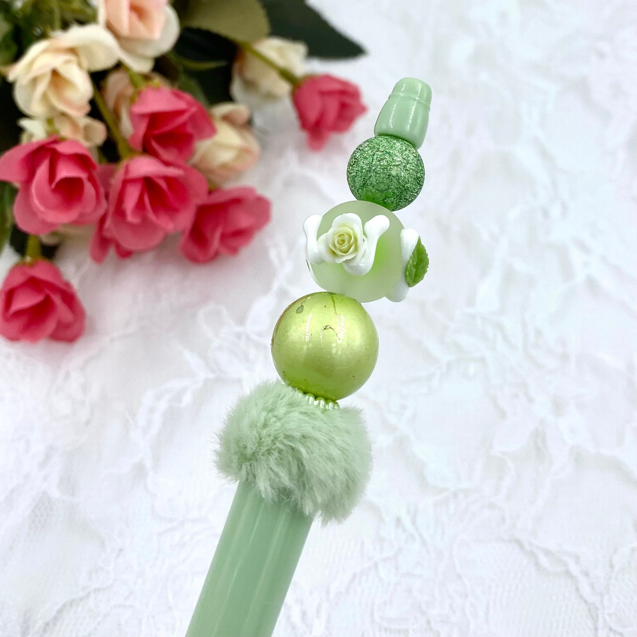 137 カスタムボールペン完成品 手書き蓄光薔薇パーツビーズ&コーラルグリーンボールペン