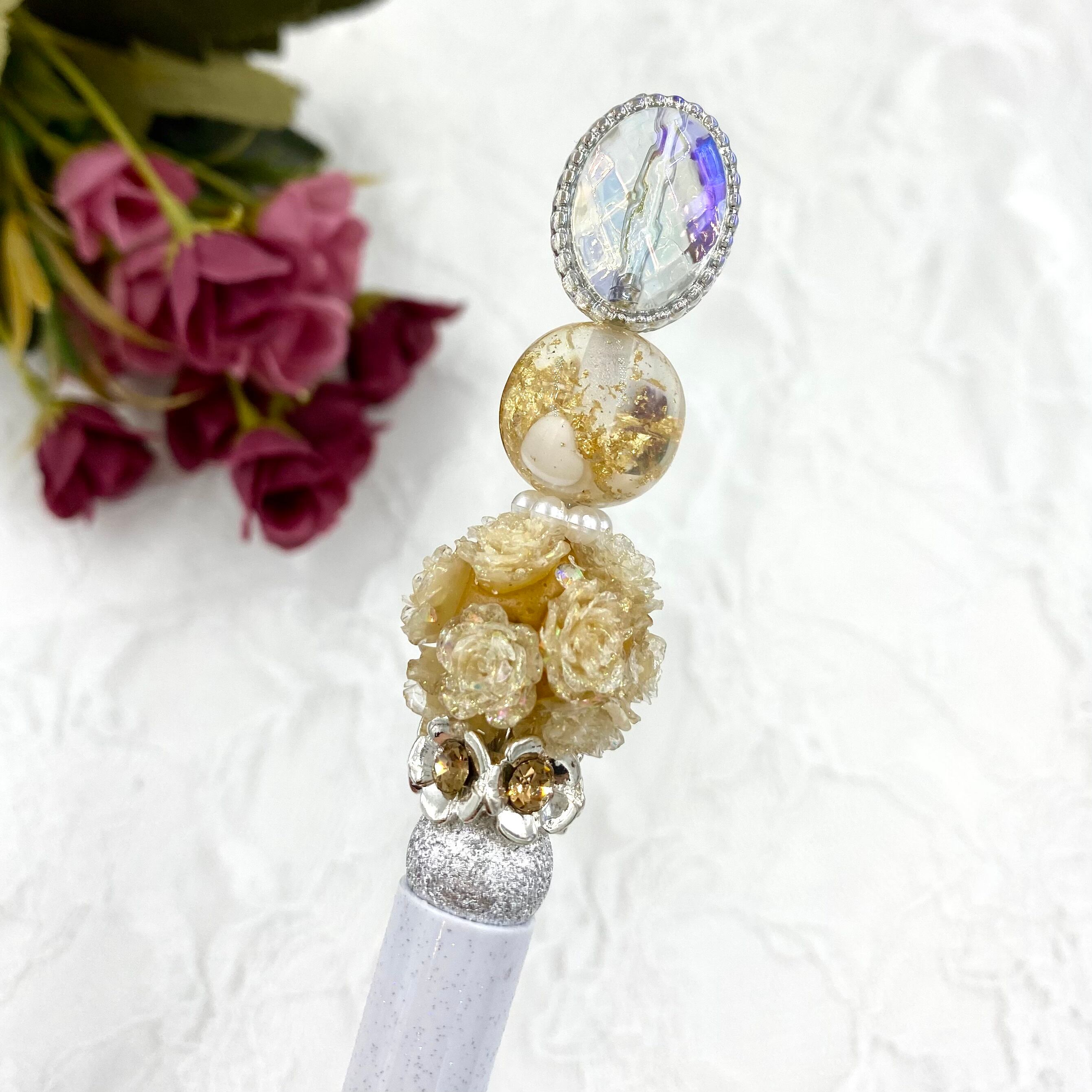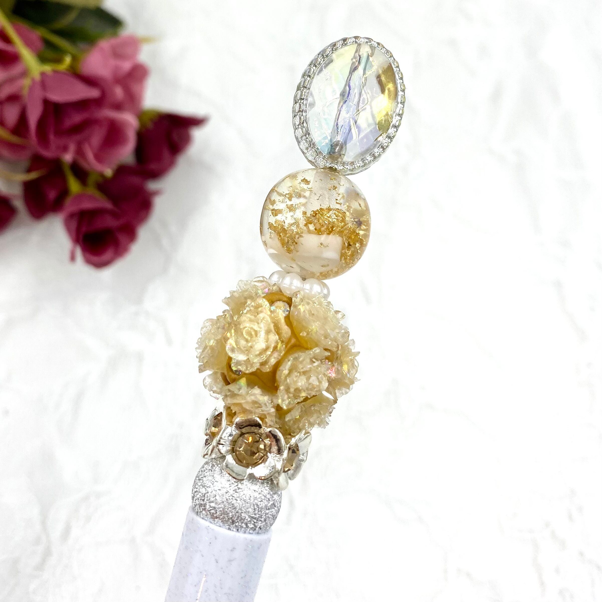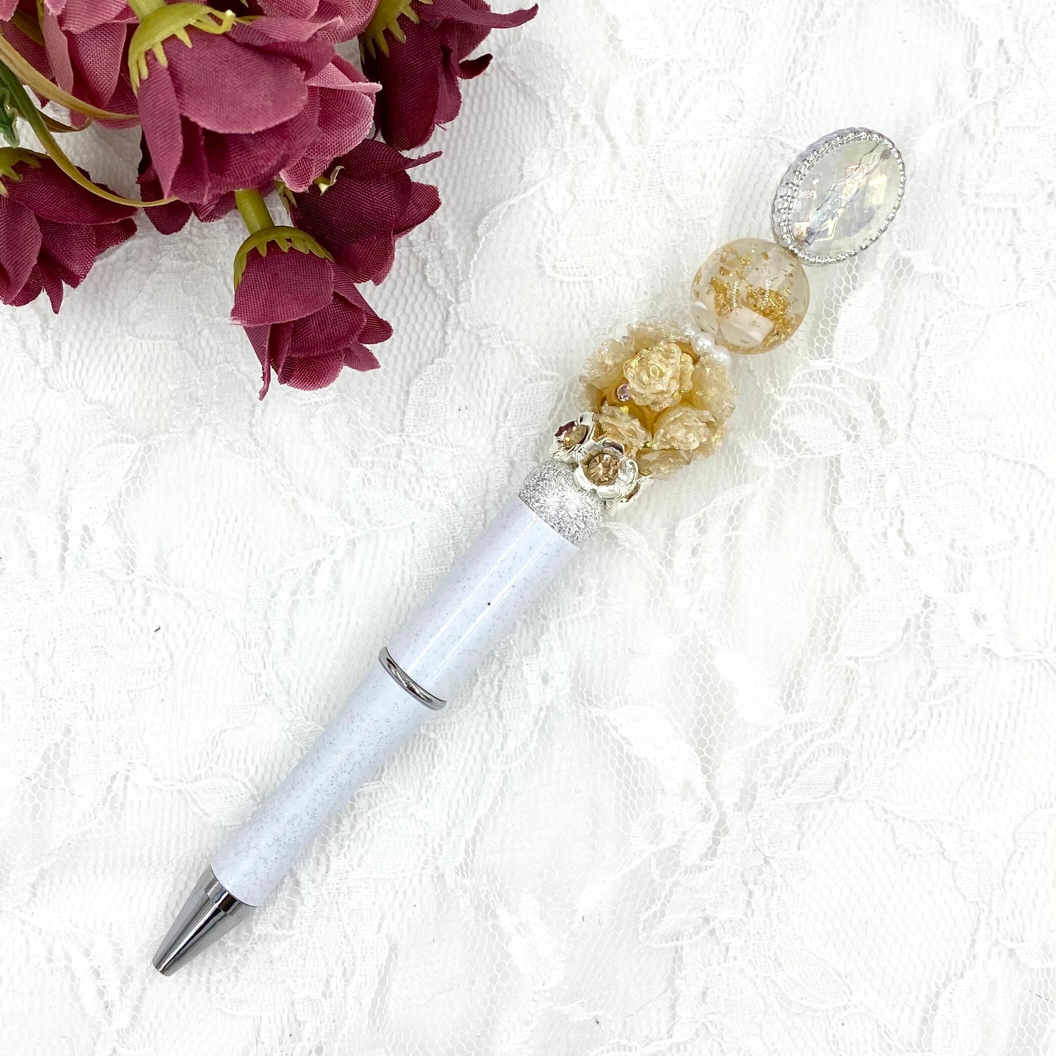 143 カスタムボールペン完成品 蓄光薔薇ビーズ・ゴールド&ラメホワイトボールペン クラシック