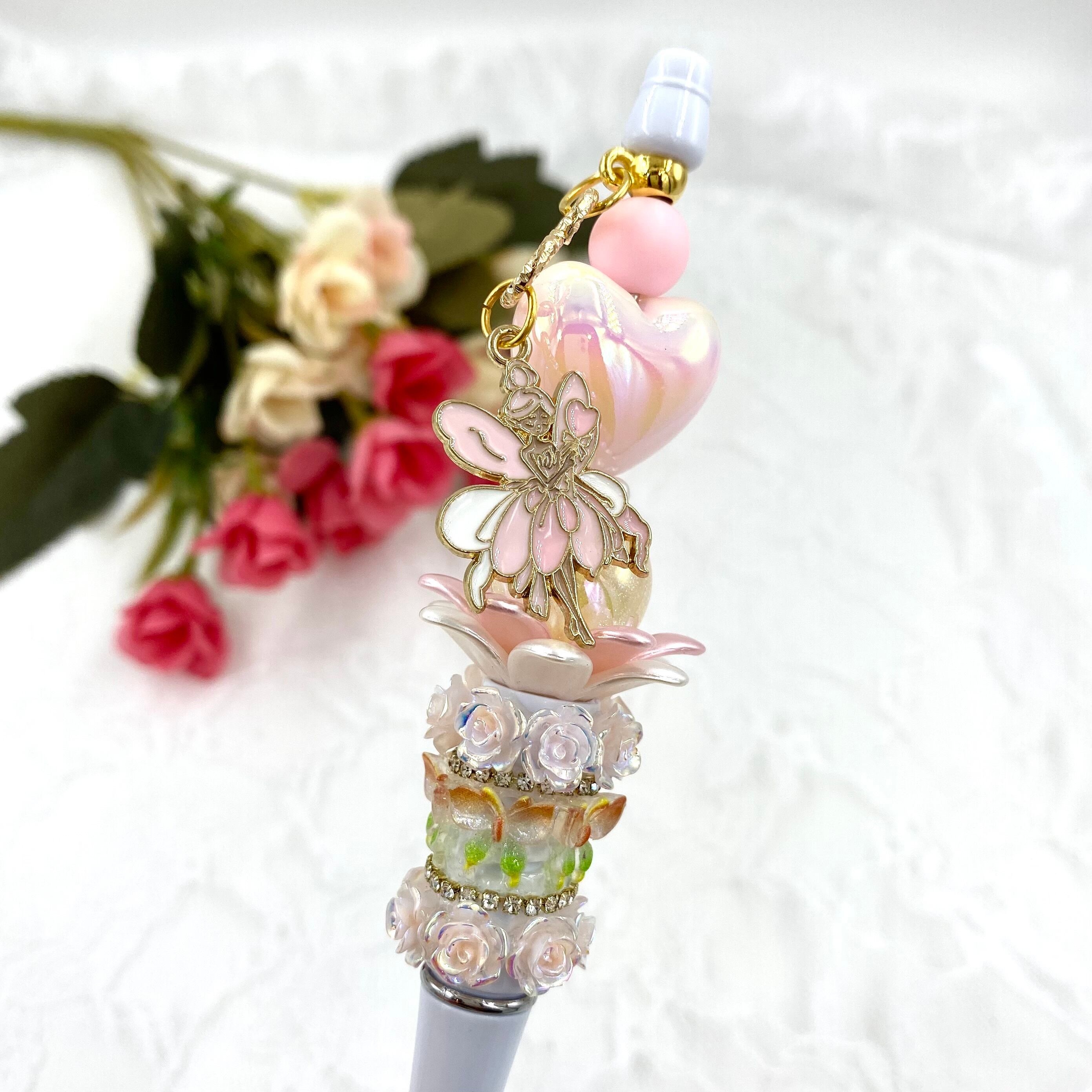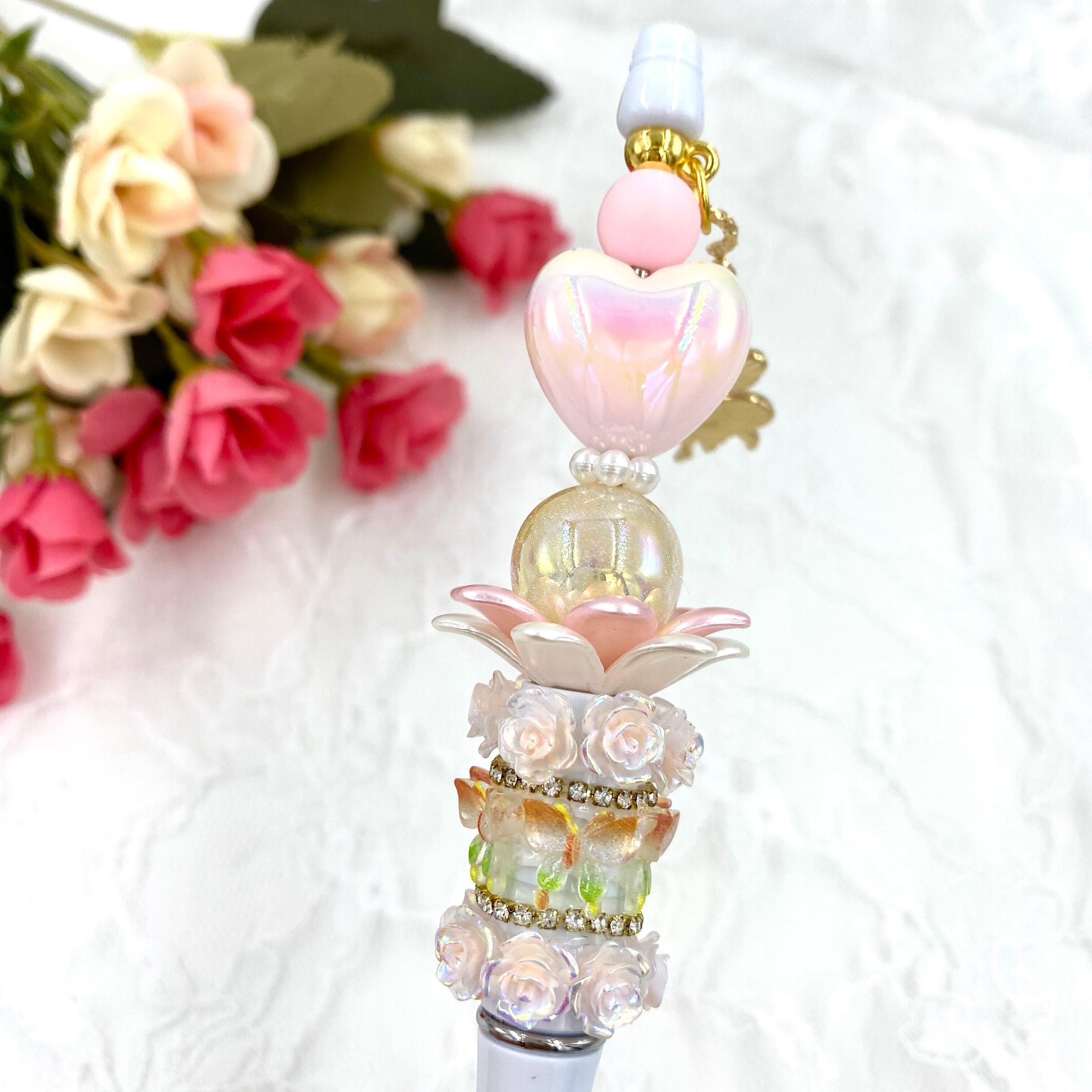 146 カスタムボールペン完成品 蓄光ハートビーズ&薔薇.蝶ホワイトボールペン クラシック