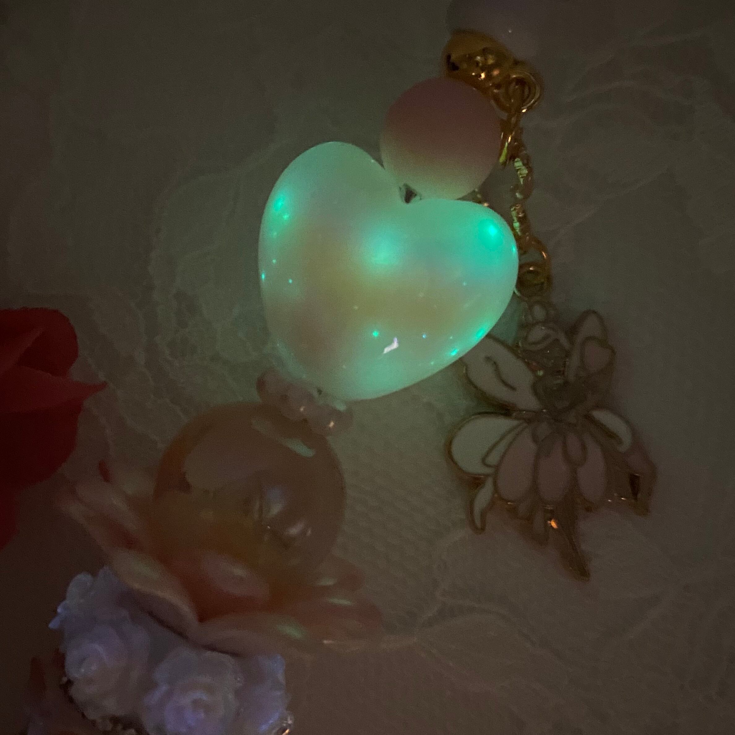※ ハートビーズが蓄光で、紫外線を吸収した分だけ暗闇で写真の様に蛍光します。