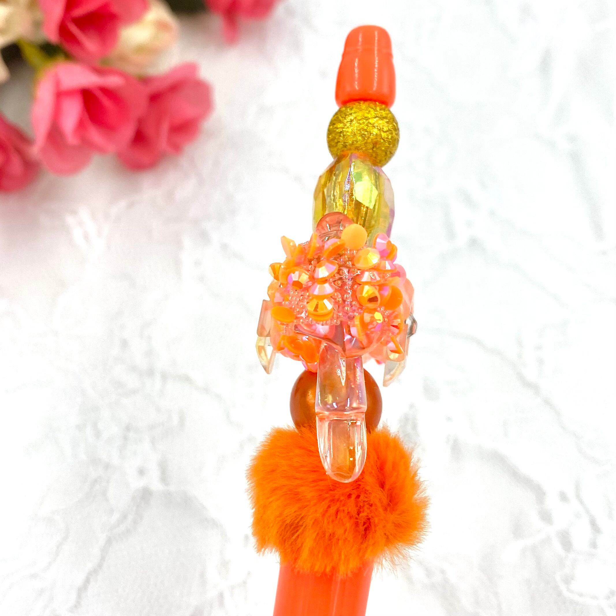 148 カスタムボールペン完成品 蛍光オレンジリボンビーズ&ふわふわオレンジボールペンオレンジボールペン