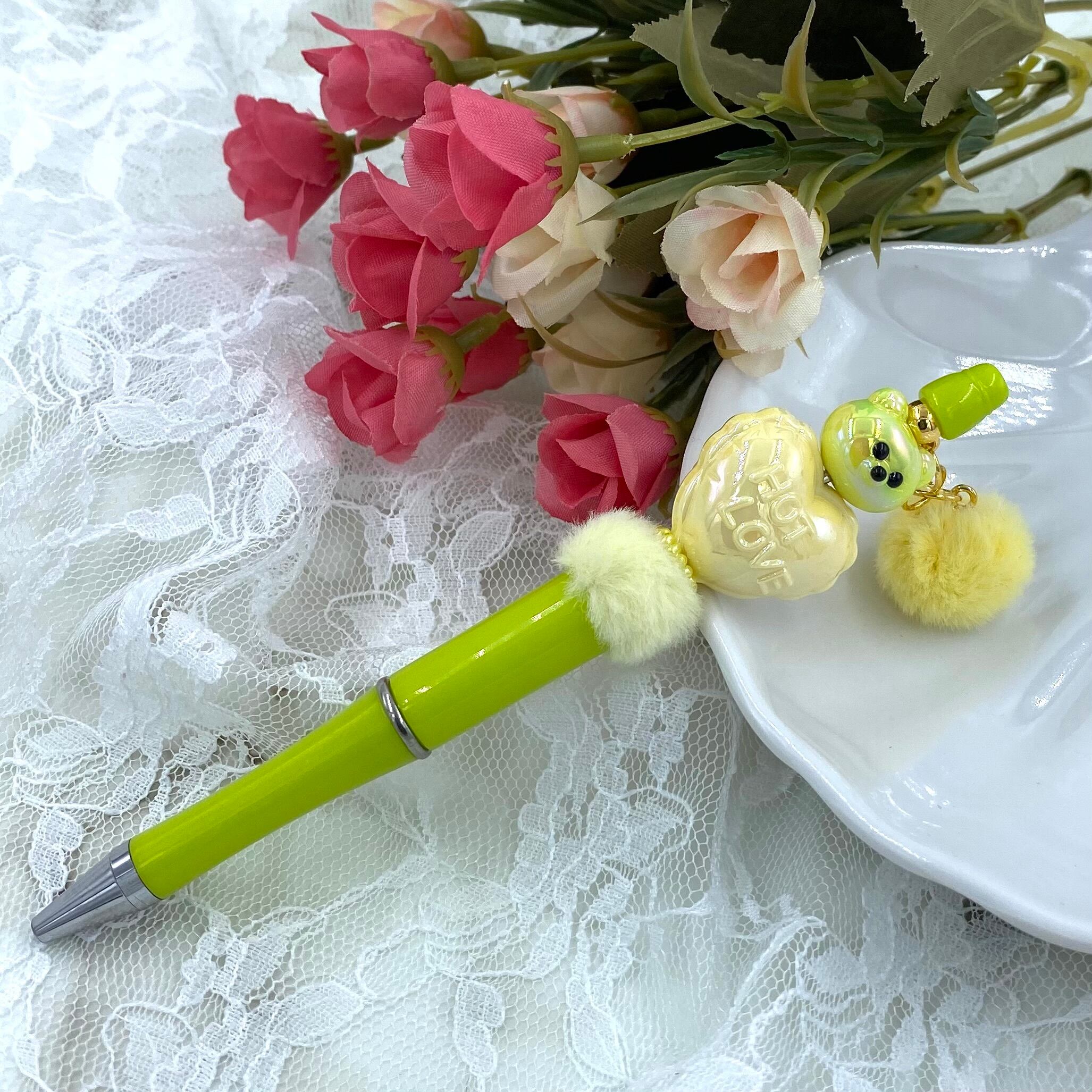 ・28 カスタムボールペン完成品 黄緑&黄色くまさん チャーム付き