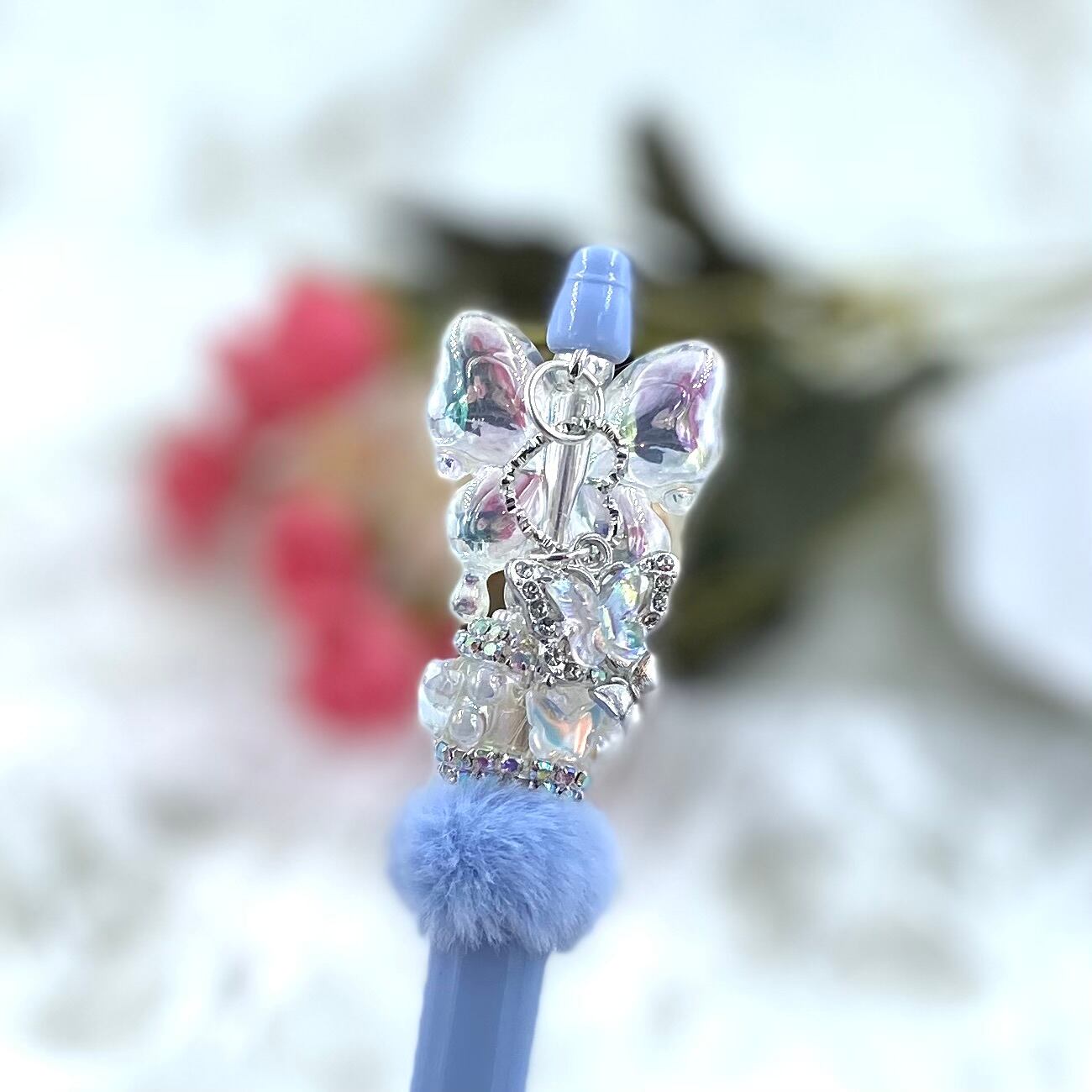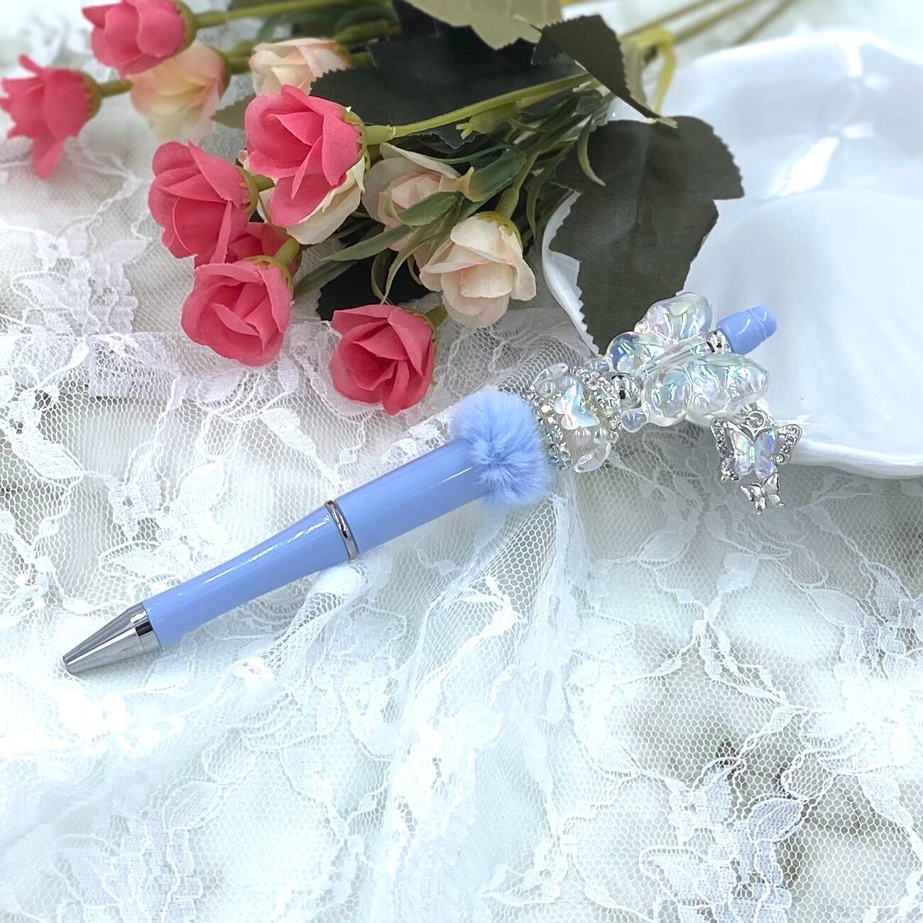 39 カスタムボールペン完成品 薄水色ふわふわクリアバタフライ 蝶チャーム付き