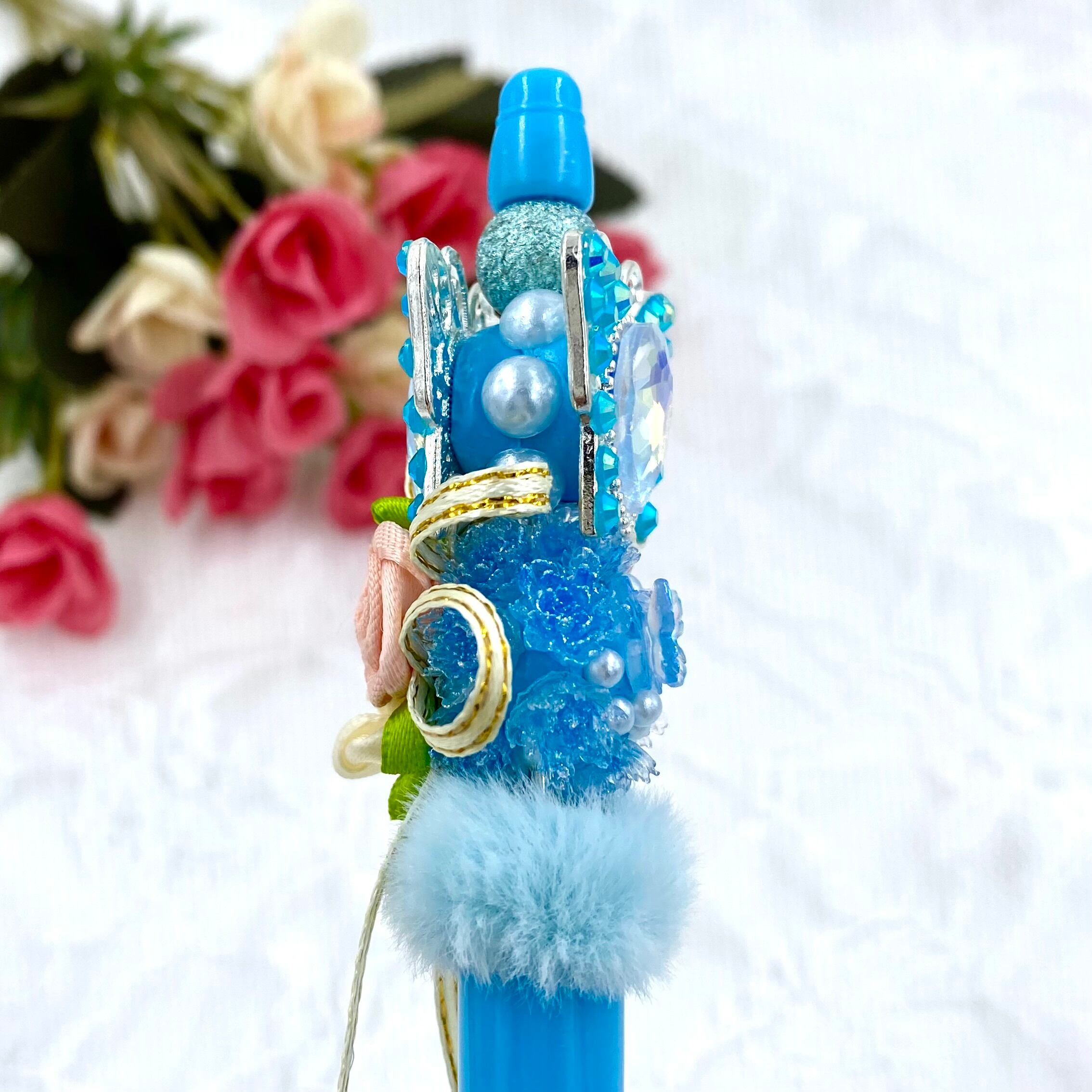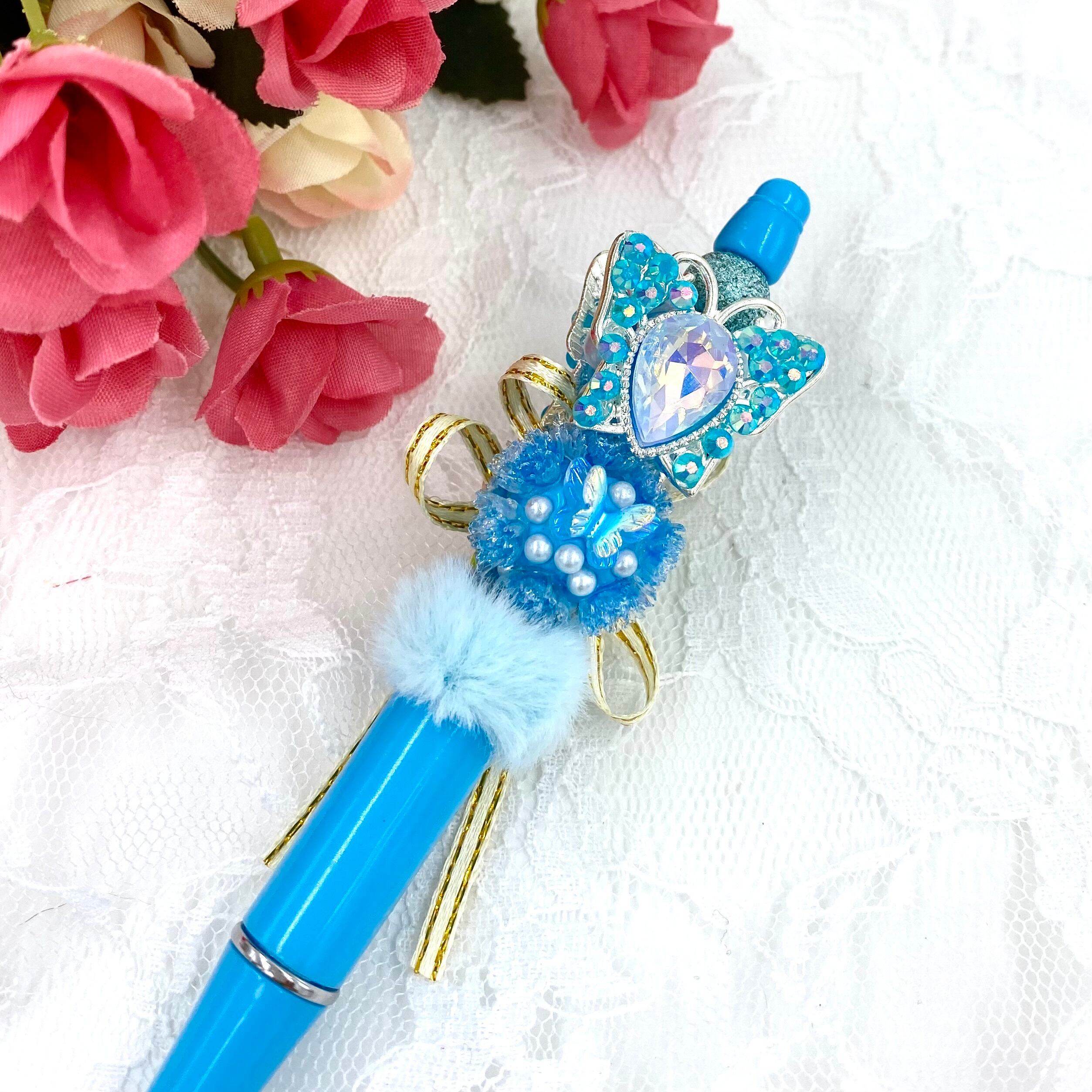 123 カスタムボールペン完成品 水色バタフライ&フラワーふわふわボールペン