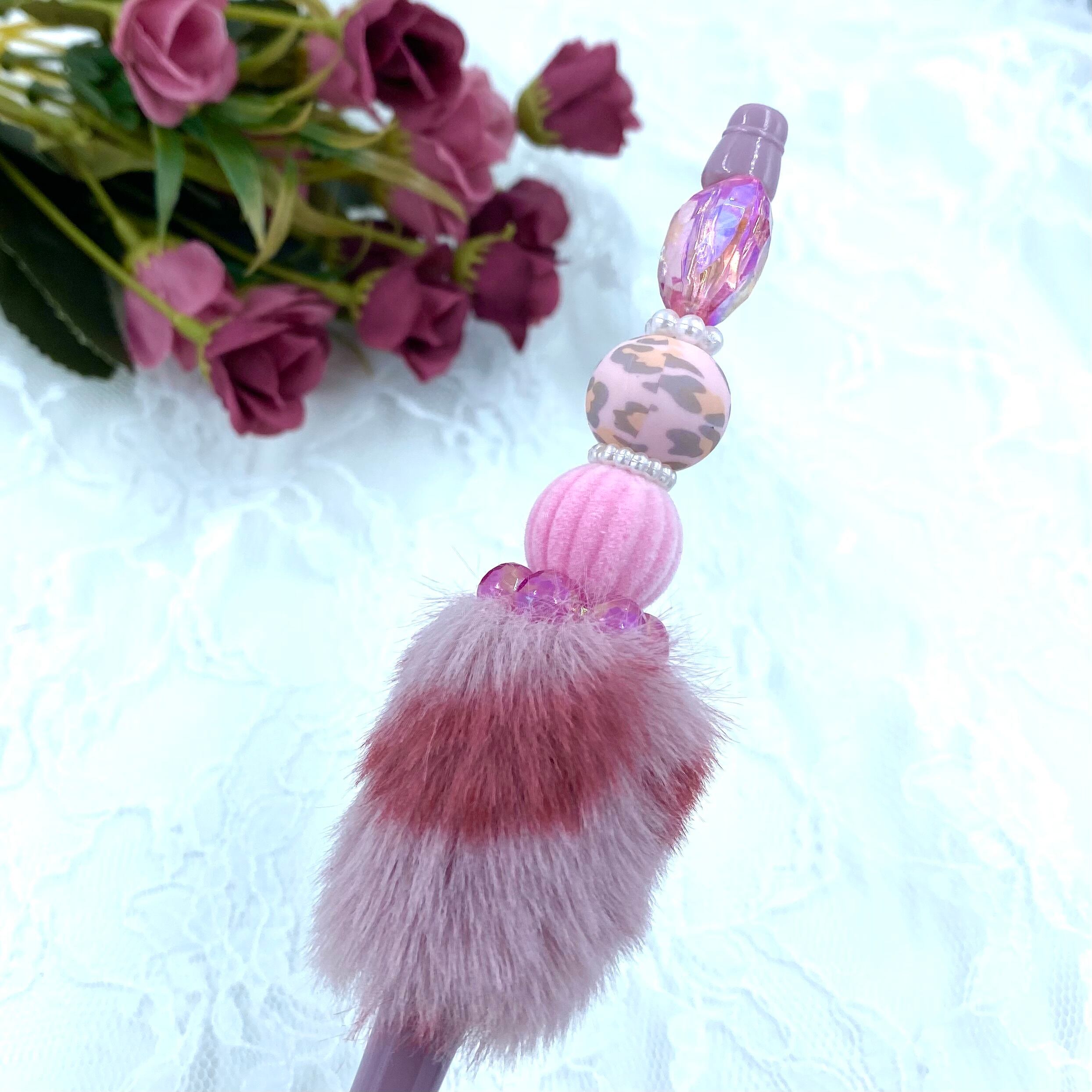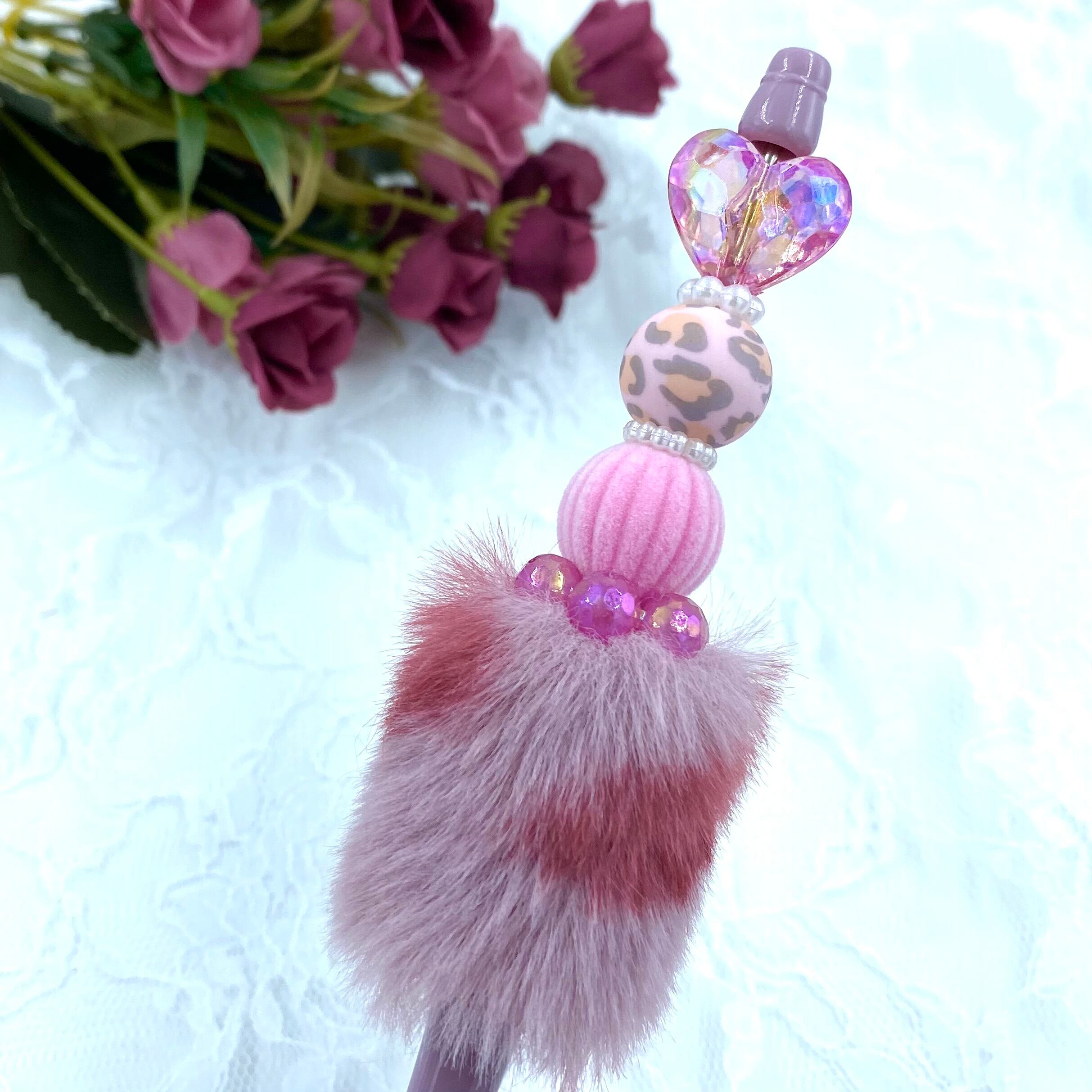 91 カスタムボールペン完成品 ヒョウ柄ピンクファー&クリアハート・フロッキー