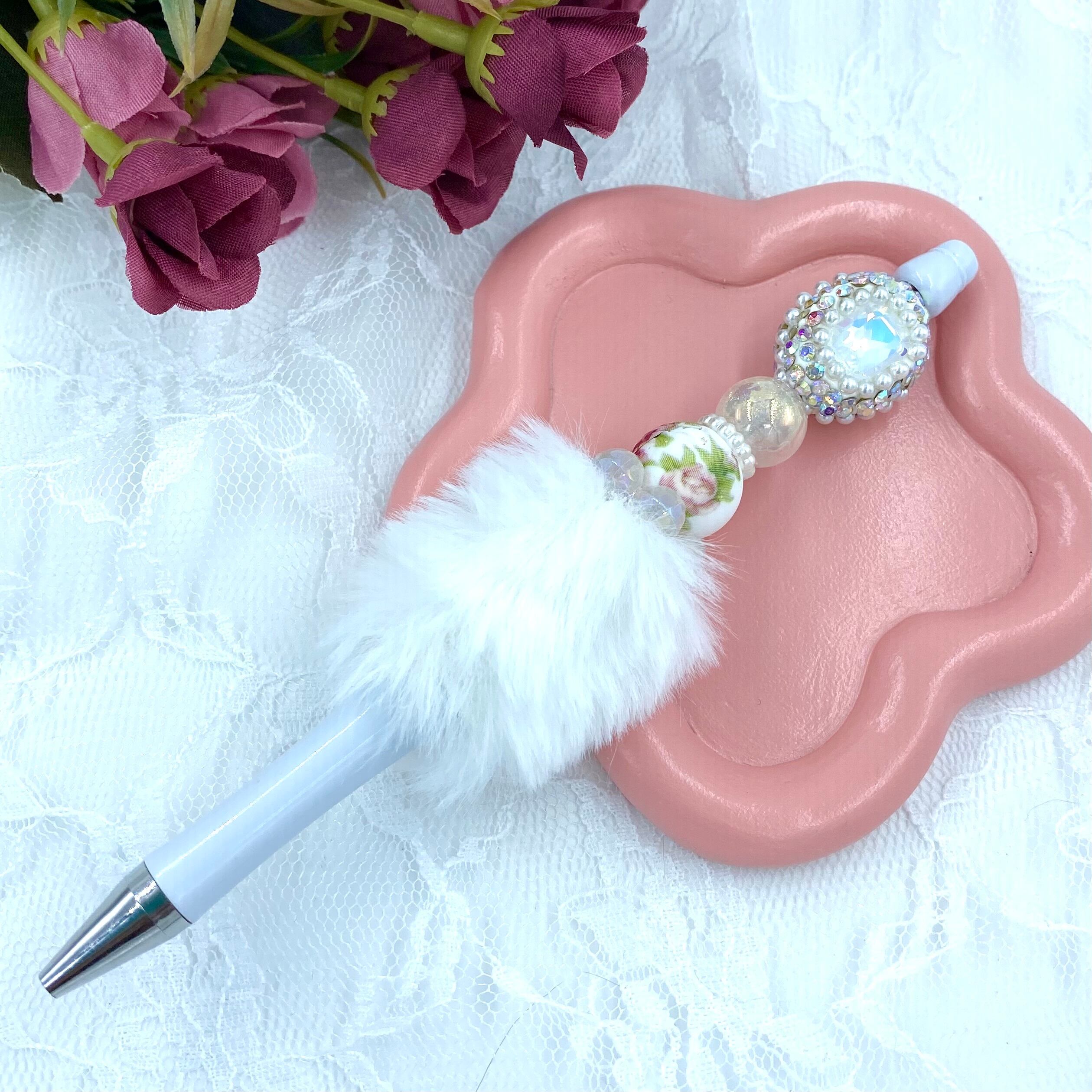 93 カスタムボールペン完成品 ホワイトファー&薔薇プリントビーズ&宝石ビーズ
