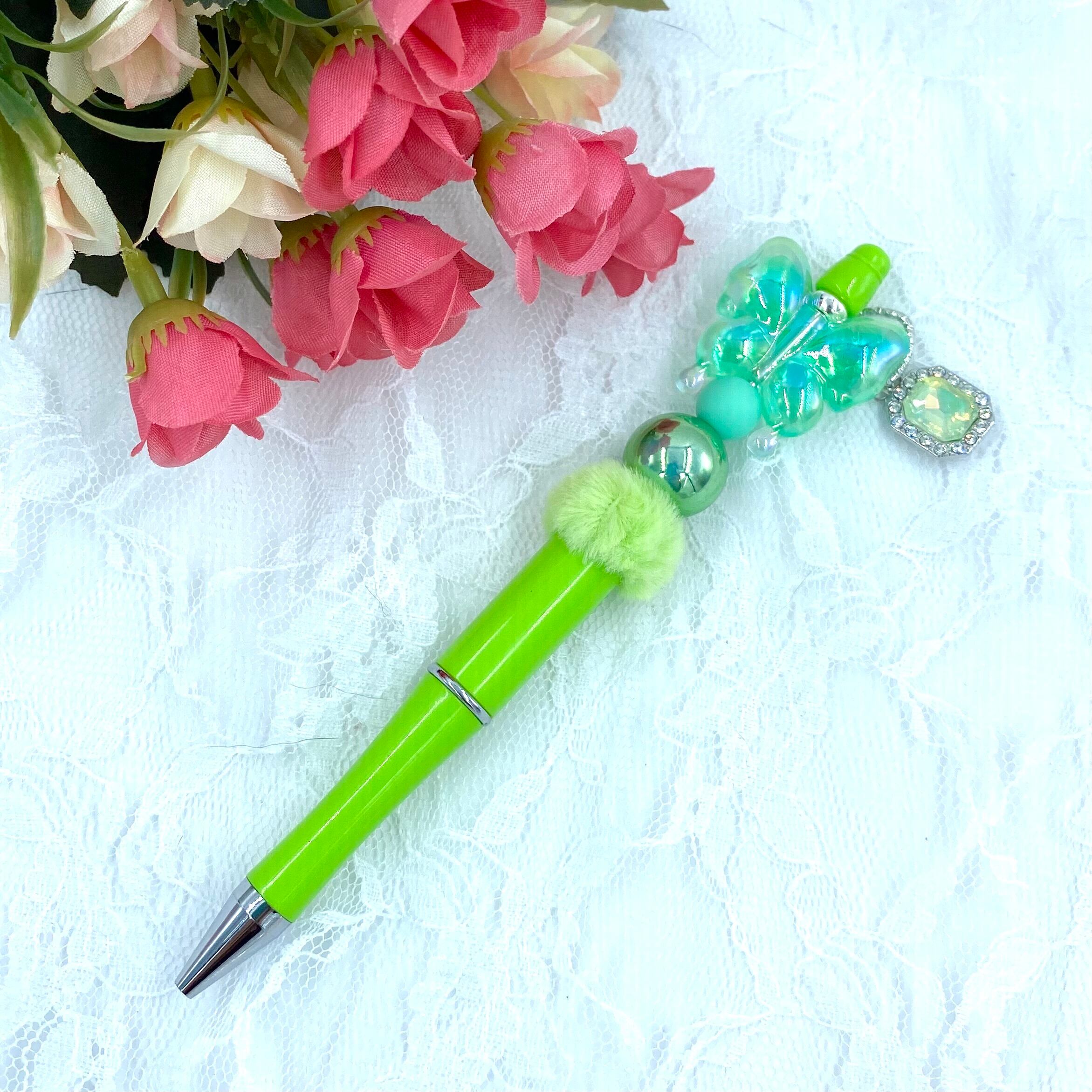 ・112 カスタムボールペン完成品 ふわふわ黄緑蝶々チャーム付き