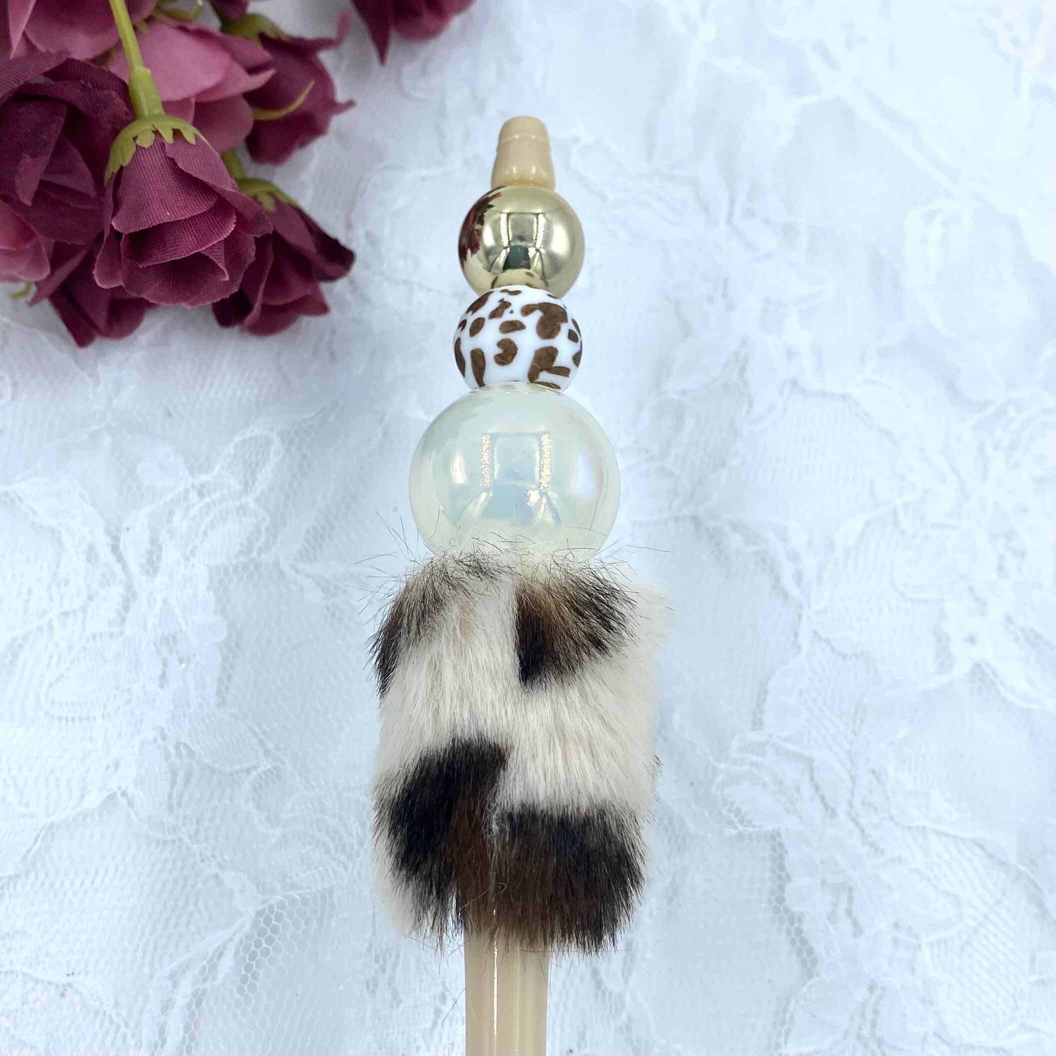 59 カスタムボールペン完成品 ベーシュヒョウ柄ファー&アニマル柄・大玉ビーズ