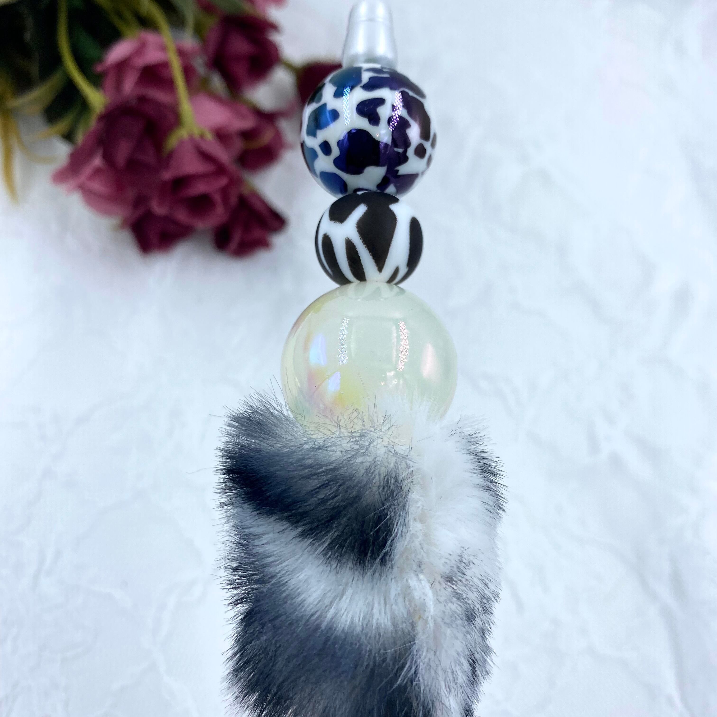 21 カスタムボールペン完成品 白ヒョウ柄ファー&アニマル大玉ビーズ