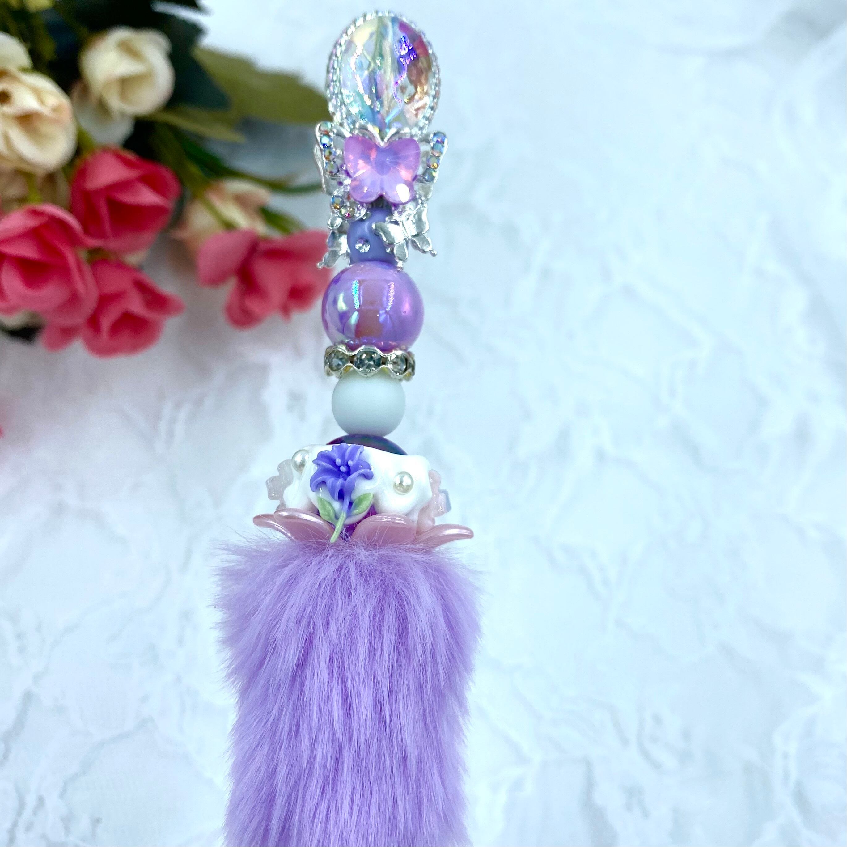 71 カスタムボールペン完成品 薄紫ファー蝶々&宝石ビーズトッパー・