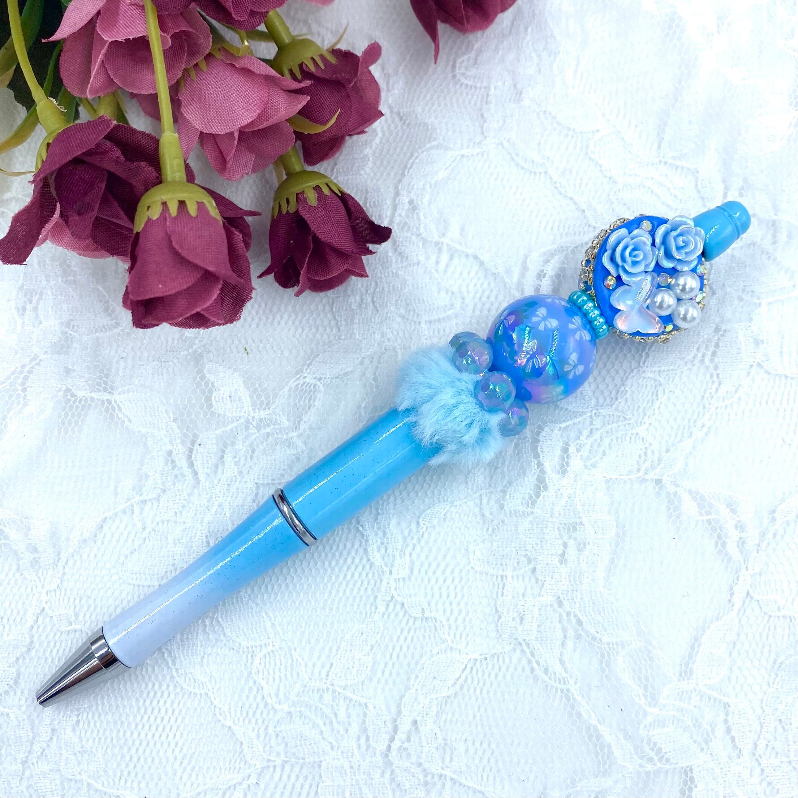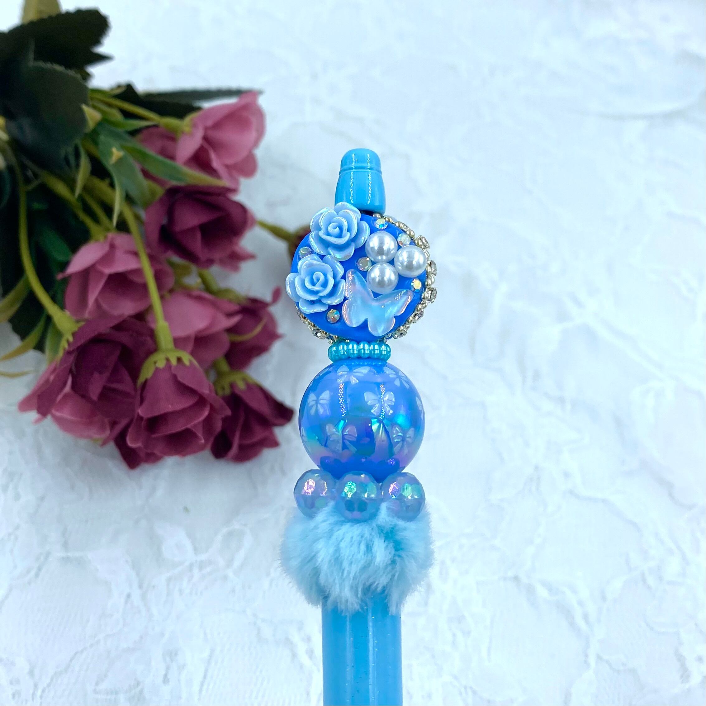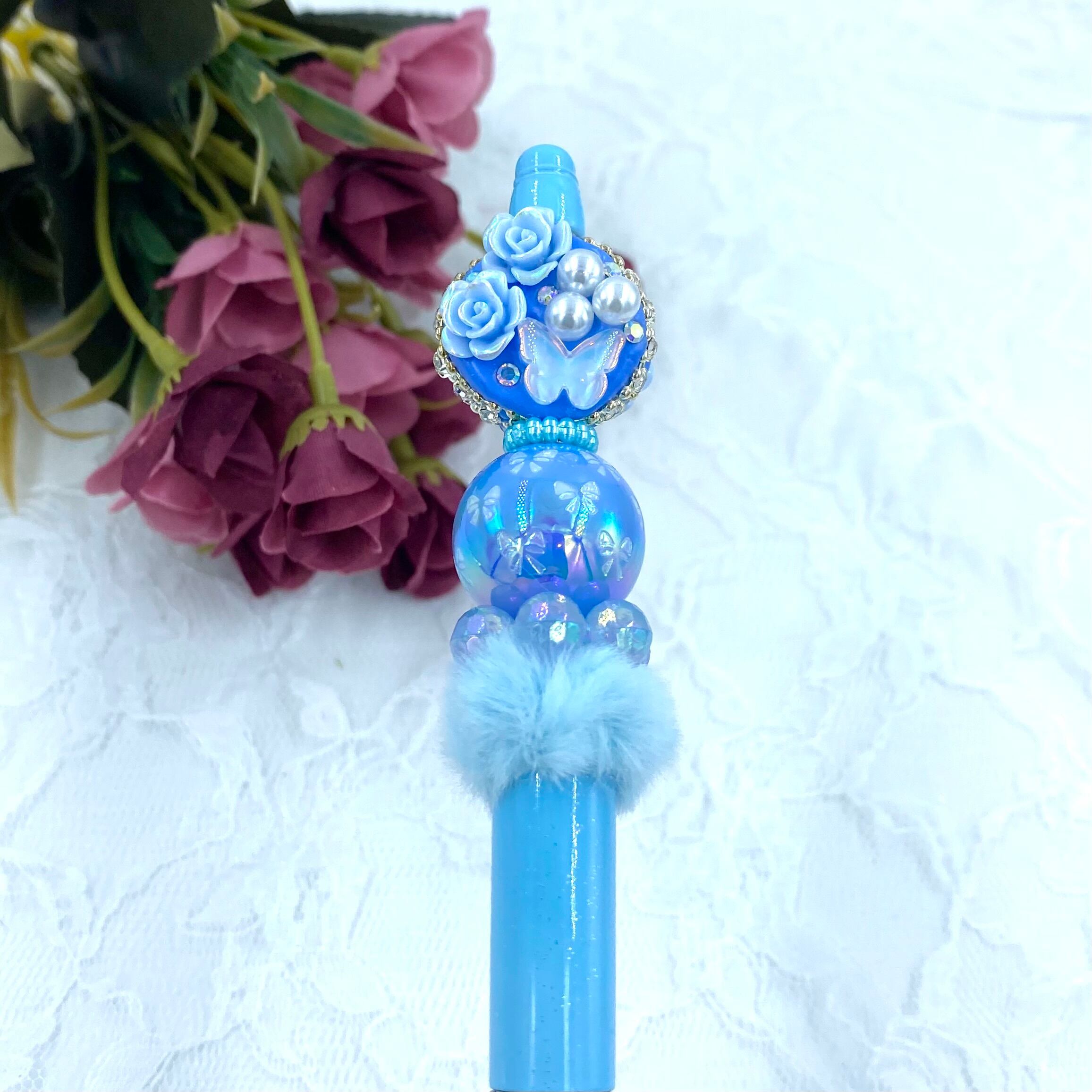 103 カスタムボールペン完成品 ライトブルーグラデション ふわふわ薔薇&蝶々