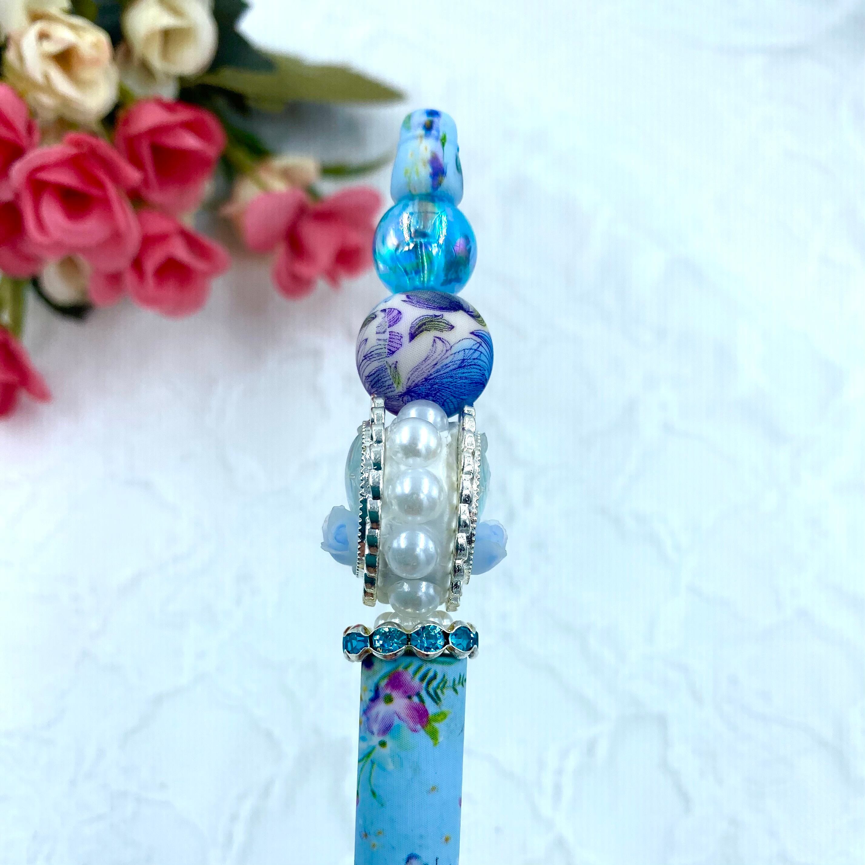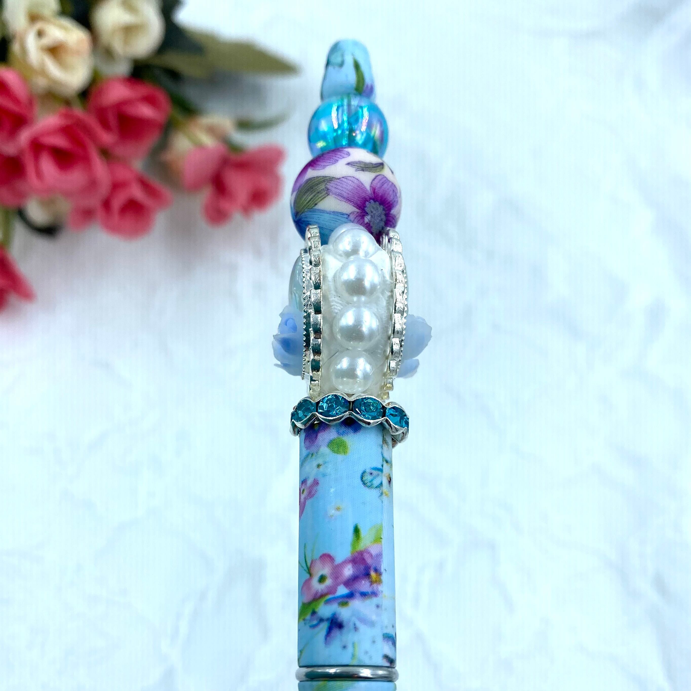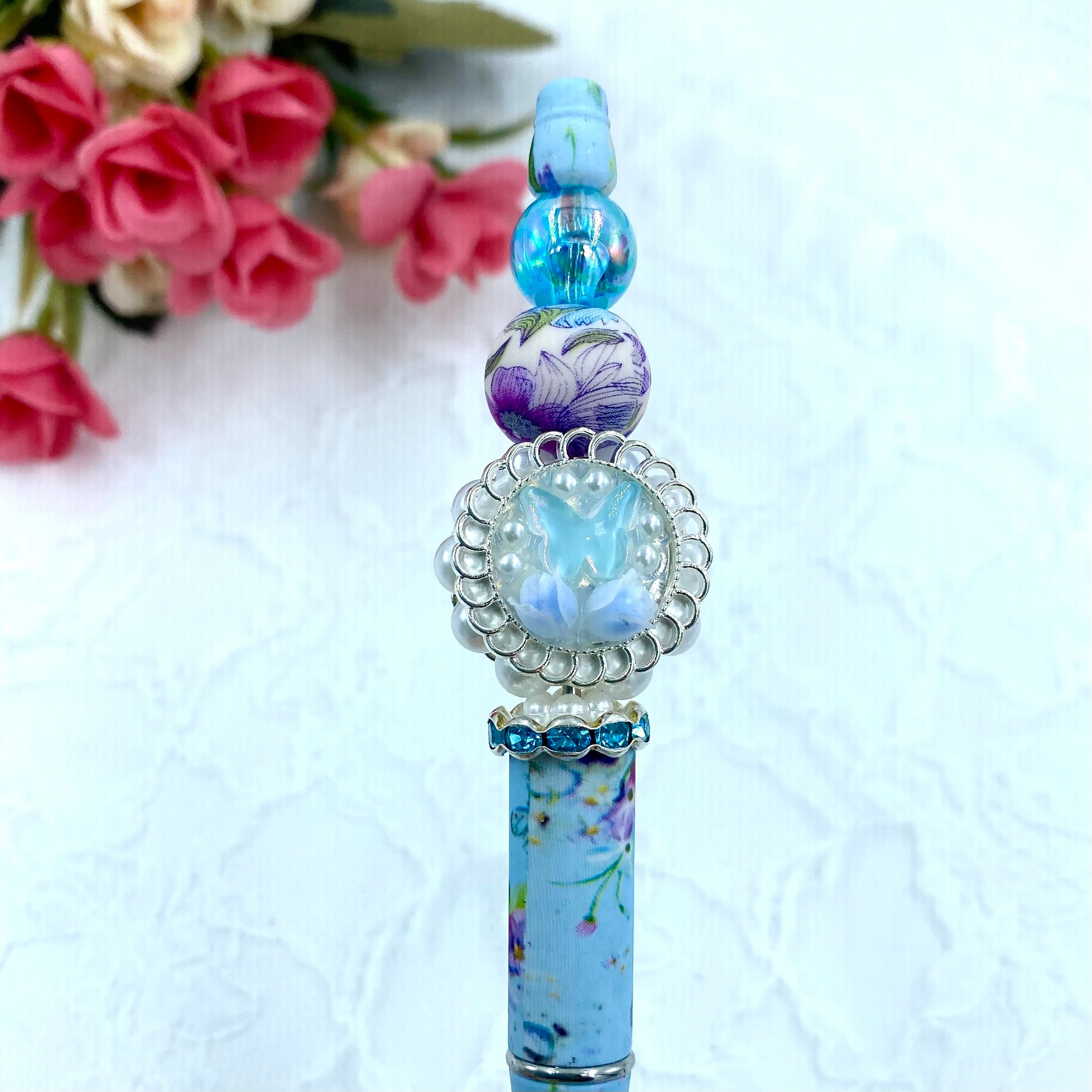 106 カスタムボールペン完成品 水色プリントちょうちょ&パール